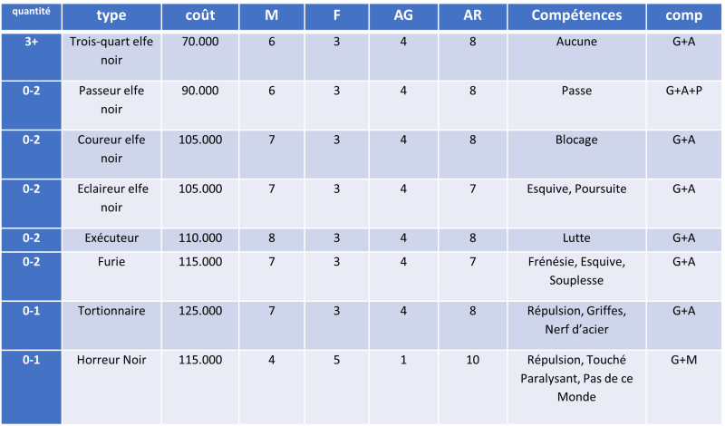 Les Elfes noirs, maîtres incontestés de l’espionnage et des vilenies, obtiennent une carte de Diseur dans la section Coup bas (en plus des cartes normalement attribuées).