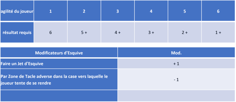 Il est important de noter qu'un jet d'Esquive est toujours requis pour quitter une Zone de Tacle, même si la case dans laquelle le joueur se déplace n'en contient pas.