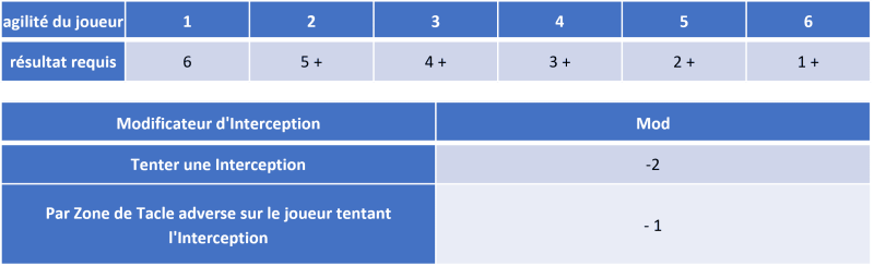 Pour savoir si l'interception réussit, consultez l'Agilité du joueur sur le Tableau d'Agilité.
